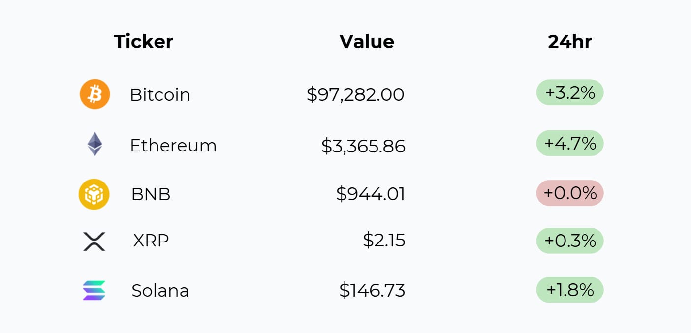 Bitcoin is holding firm above $97,000 with a 3.2% gain, but the true leadership signal comes from Ethereum, which is outperforming BTC by a significant margin, confirming a clear risk-on appetite at the top of the board. While the top two assets drive the momentum, the rest of the market shows mixed participation, with majors like XRP and BNB remaining essentially flat, indicating that the current rally lacks broad market breadth.