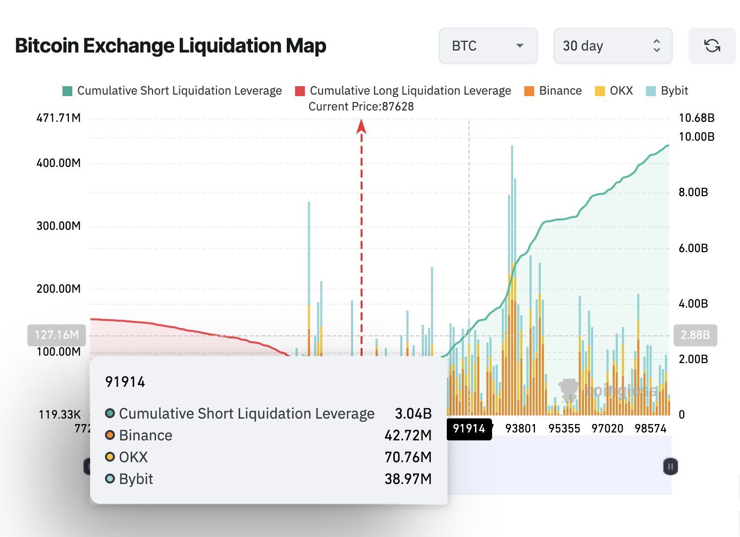 If Bitcoin spikes toward the ~$92K zone, roughly $3B in short positions would get liquidated across major exchanges.