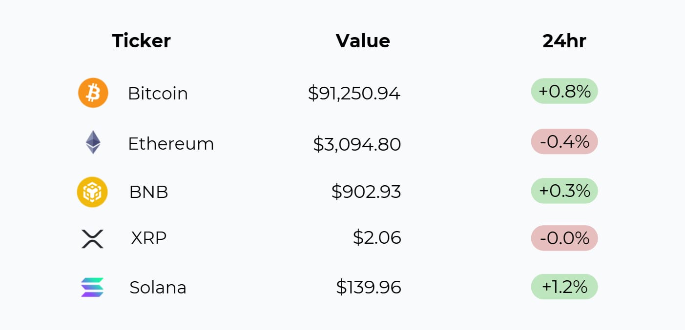 Bitcoin holds above $91K, keeping the tape mildly green as Solana leads again. Ethereum and XRP lag, signaling selective rotation rather than broad momentum.