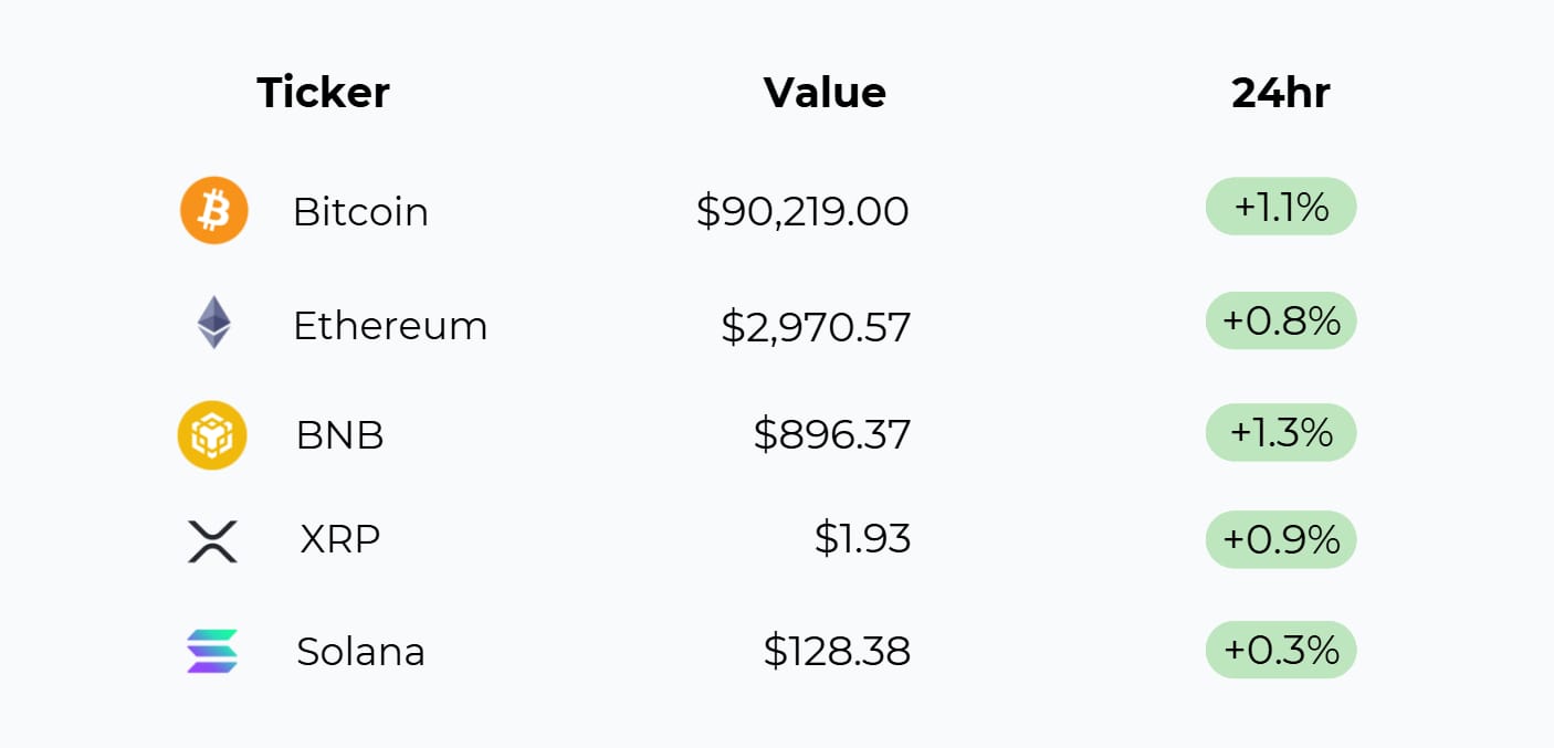 Bitcoin holds above $90,000 with a 1.1% gain, though the strongest momentum among the majors belongs to BNB, which is currently leading the board. While Ethereum and XRP maintain positive, steady gains, the overall breadth remains uneven, evidenced by Solana's significantly muted performance relative to the rest of the large-cap assets.