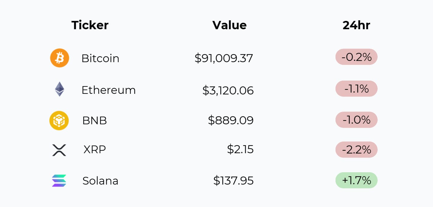 Market is mixed and lethargic, with Bitcoin flat near $91K and most majors drifting lower. Solana stands out as the lone strength, suggesting selective dip-buying rather than broad risk-on.