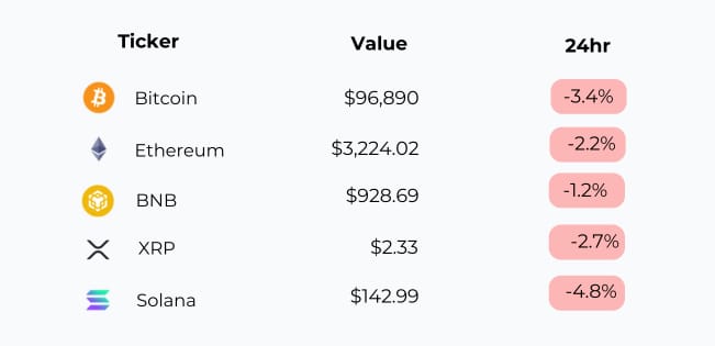 Markets are bleeding deeper today. Bitcoin has slipped below $97K, Ethereum is hovering just above $3.2K, and Solana continues to lead the downside with nearly a 5% drop. XRP and BNB are also firmly in the red. The selloff feels like exhaustion rather than panic, volumes are thinner, and buyers are mostly waiting it out. It’s a risk-off close to the week, with traders stepping back rather than fighting the momentum.